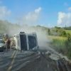 Itabela: Carreta com carga de cimento tomba e interdita totalmente a BR-101