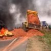 Vídeo: Caçamba tomba enquanto colocava terra para bloquear rodovia; assista