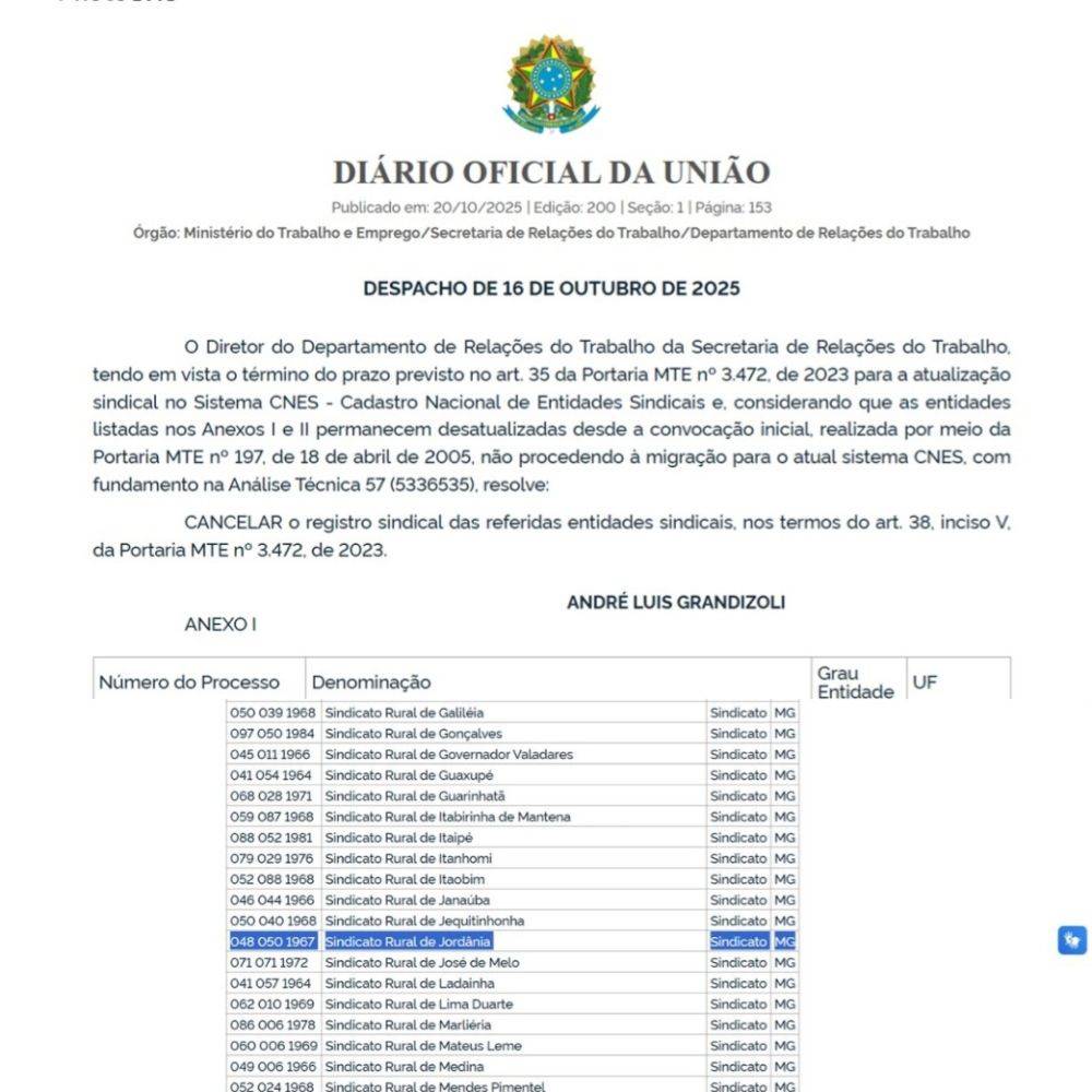 Segundo o governo federal, o Sindicato Rural de Jordânia não atualizou seus dados cadastrais no Cadastro Nacional de Entidades Sindicais (CNES), sistema obrigatório desde 2005.