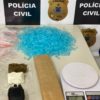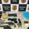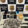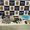 Em poder da quadrilha foram aprendidos 02 (dois) revólveres, 13 (treze) munições calibre .38, 04 (quatro) munições calibre .22, 01 (uma) munição calibre .762, geralmente utilizada em fuzil, 01 (um) simulacro de pistola, aproximadamente 700g de maconha, 133 (cento e trinta e três) buchas de maconha já embaladas para comercialização, aproximadamente 100g de cocaína, 05 (cinco) pinos de crack, 03 (três) balanças de precisão, centenas de cápsulas vazias e saquinhos também vazios, utilizados para embalar drogas, 01 (um) rádio comunicador, 08 (oito) aparelhos celulares e 01 (uma) motocicleta com sinais identificadores adulterados.