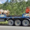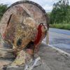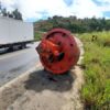 Uma carreta carregada com motores navais utilizados em grandes embarcações rompeu as fitas de segurança que prendia um dos equipamentos e um dos motores acabou caindo na estrada.