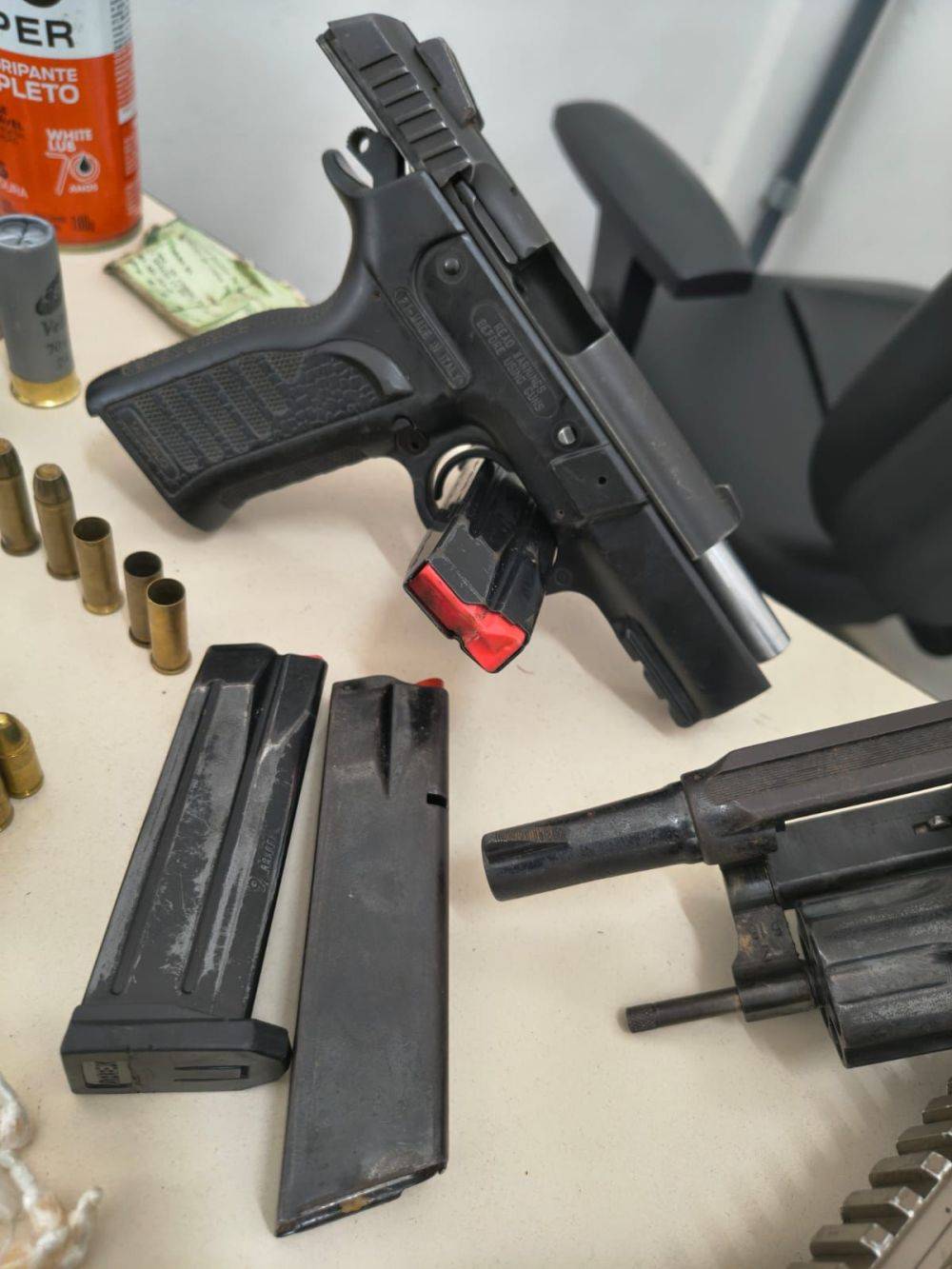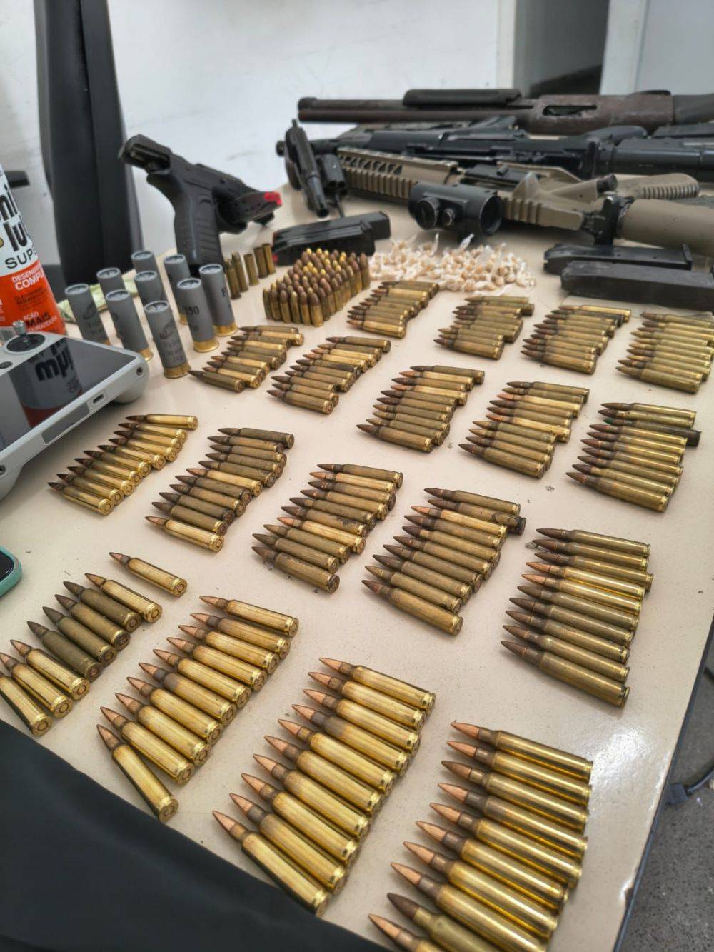 Após o revide, os policiais realizaram varredura na área e localizaram um verdadeiro arsenal. Foram apreendidos dois fuzis calibre 5,56 mm, uma escopeta calibre 12, uma submetralhadora artesanal calibre 9 mm, uma pistola calibre 9 mm e um revólver calibre .38. Também foram encontradas diversas munições, carregadores, 153 pedras de crack, aparelhos celulares, um drone, um carregador portátil e outros objetos usados na prática criminosa.